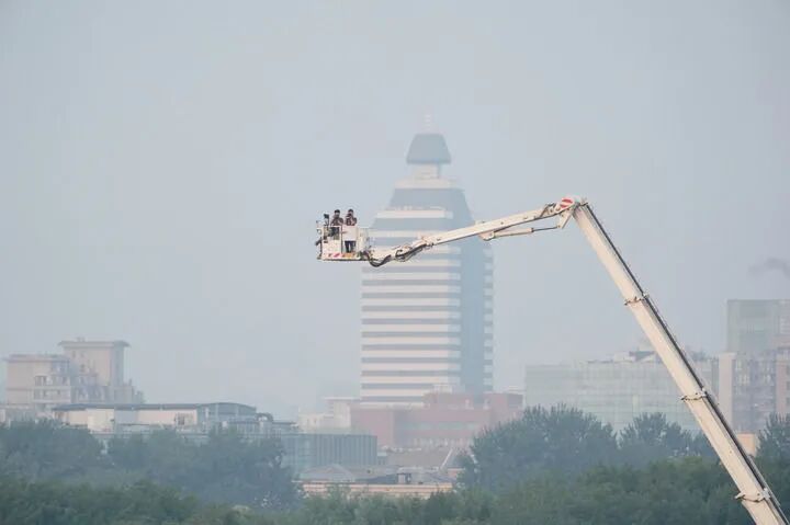 2025年9月3日清晨,报道纪念中国人民抗日战争暨世界反法西斯战争胜利80周年大会的媒体记者在工作中。新华社记者 赖向东 摄